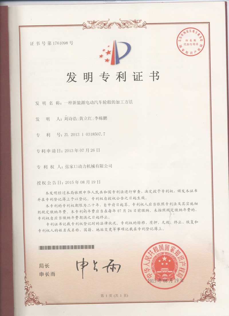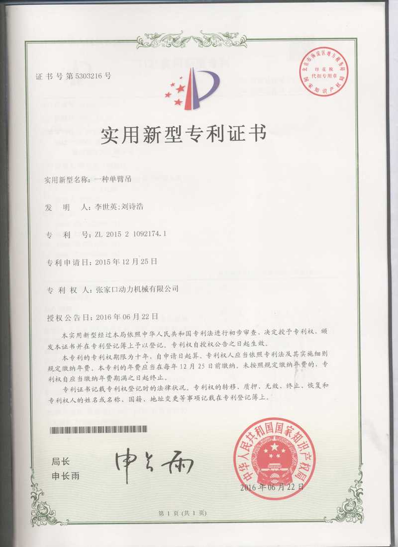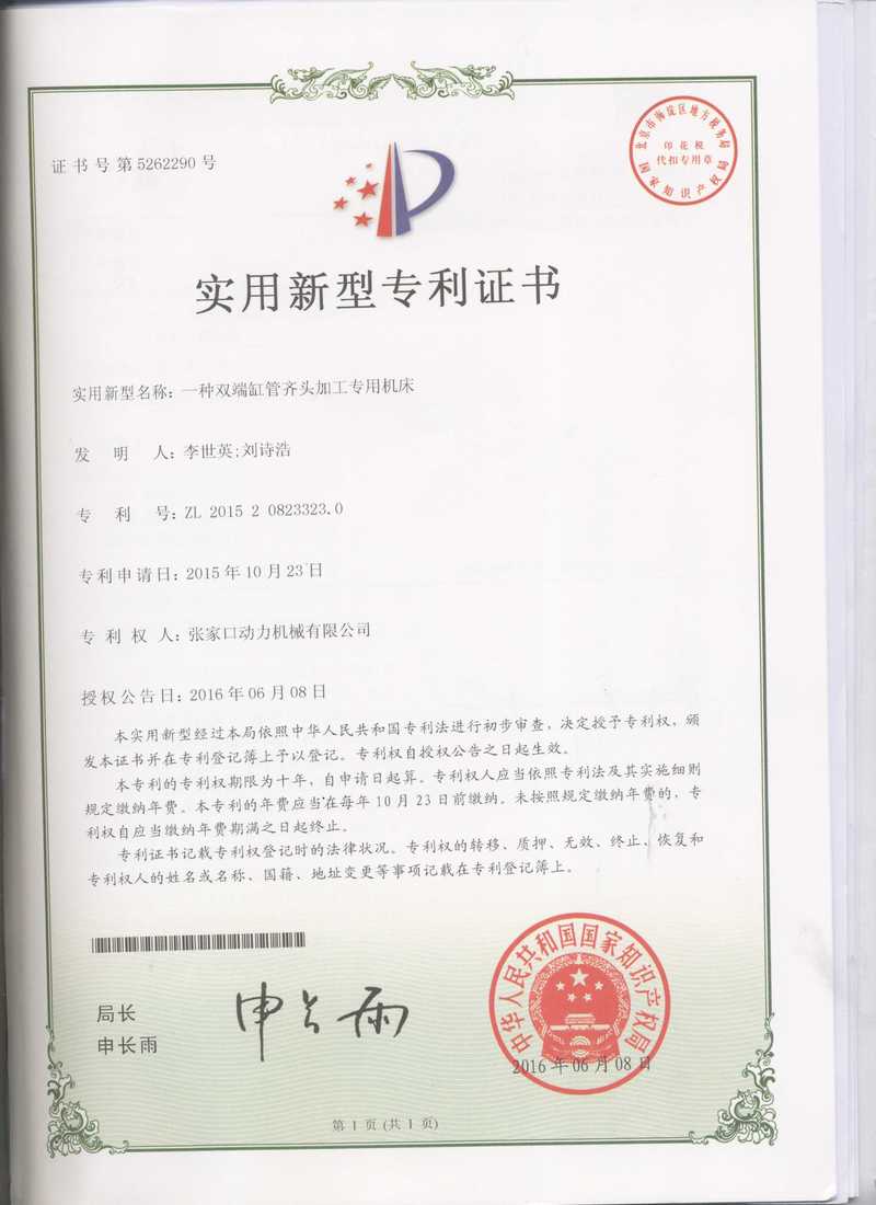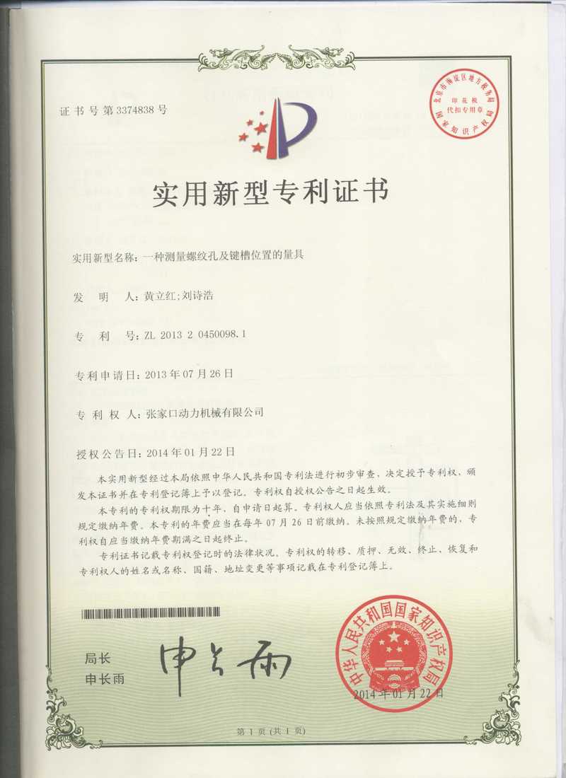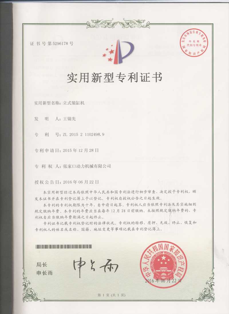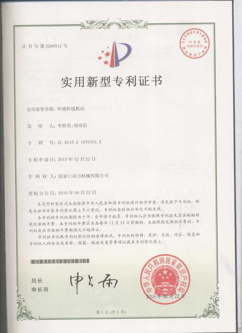 張家口動務機械有限公司專利證書展示